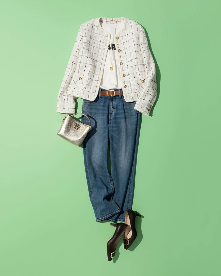 ツイードジャケット(着回し)Tシャツ¥1,980(アメリカンホリック/アメリカンホリック プレスルーム) デニムパンツ¥12,980(インディヴィ/ワールド プレスインフォメーション) バッグ¥57,200〈ペリーコ〉 ベルト[参考価格]¥24,200〈アトリエ アンボワーズ〉(ともにアマン) パンプス¥18,150(ダイアナ/ダイアナ 銀座本店) ネックレス¥3,080(アネモネ/サンポークリエイト)