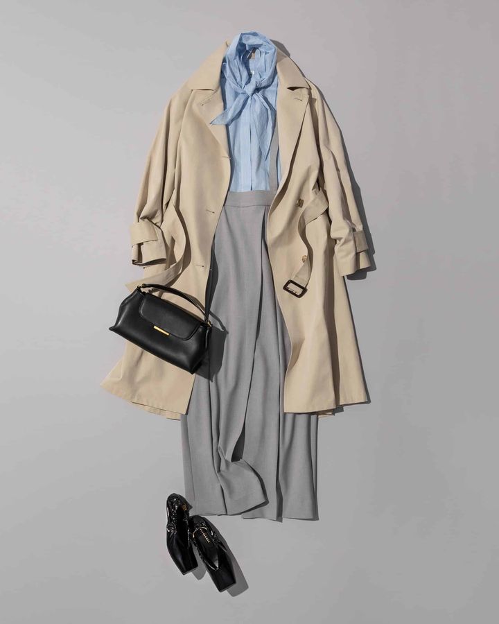 スカーフ付きのシャツやアシメトリーなタック使いが効いたサスペパンツなど、トレンチがシンプルだからこそ、デザイン性があるアイテムをチョイスすると◎。足元にはスクエアトウのキトゥンヒール靴を合わせてトレンド感をプラス!小物の色は黒で統一してオフィスに相応しいきちんと感を。