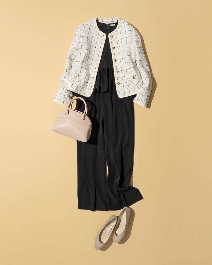パンツでセレモニースタイルなら短丈のツイードジャケットで視線を上げるとうまくいきます。トップスのペプラム切り替えとの相乗効果でスッキリ脚長見えが叶います。生地感のしっかりしたツイードなので上半身が貧相に見えるお悩みも回避できます。バッグと靴は淡い色を選んで春らしく。