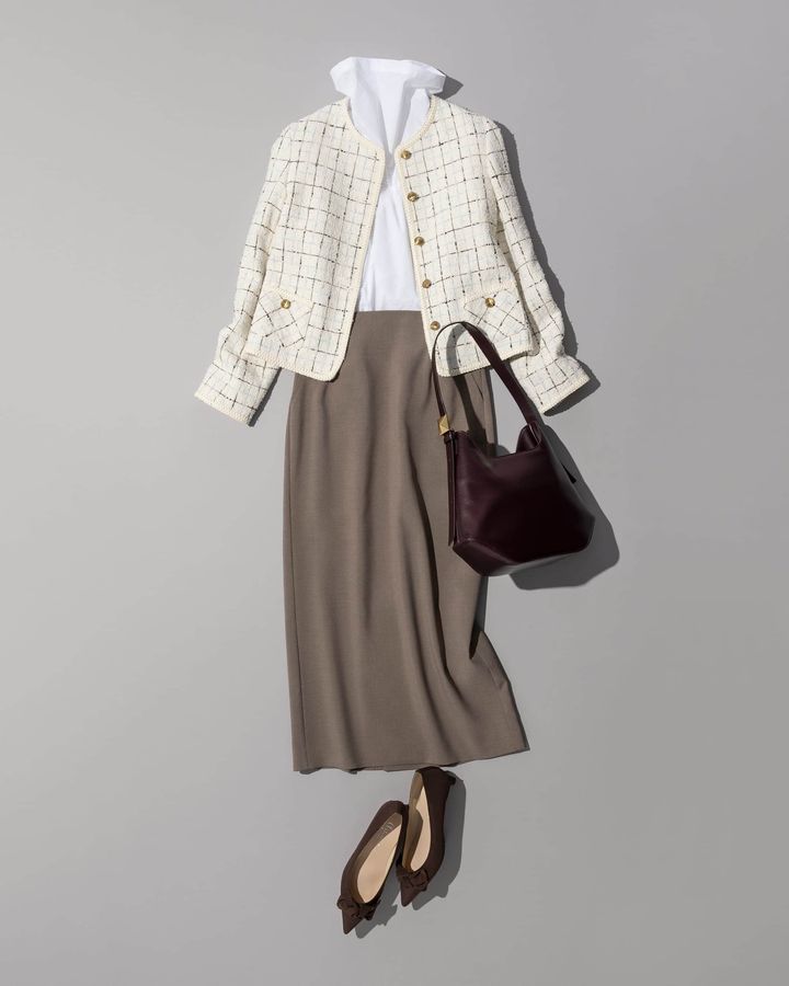 金ボタンやパイピング使いなど、ほんのり甘さが漂うツイードジャケットだから、ボウタイではなくクールなハイネックのブラウスをチョイス。ボトムには無駄をそぎ落としたペンシルシルエットのスカートを合わせてスッキリ見えを叶えます。ブラウン小物できちんとしつつも今っぽい雰囲気に。