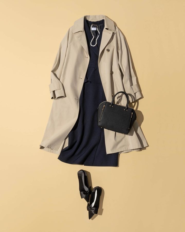 ネイビーワンピにトレンチを羽織る王道セレモニースタイル。誰もが美人度アップして見えるネイビーワンピは、胸元のカシュクールやウエストのペプラムシルエットで差を付けて。きちんと感を最重視した黒小物合わせでも、トレンチのベージュ色の面積が広いので重すぎません。足元にはリボン使いが洒落たぺたんこパンプスを選んで抜け感を。