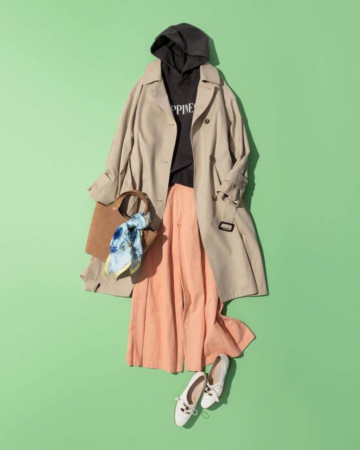 定番トレンチはアイテム自体がきちんとしているのでカジュアルに合わせても子供っぽくならないのがいいところ。スウェットのフードを外に出して着こなすと洒落見えします。カラーパンツとスカーフの色遊びで春らしく。足元は白のレースアップシューズで軽やかに仕上げました。