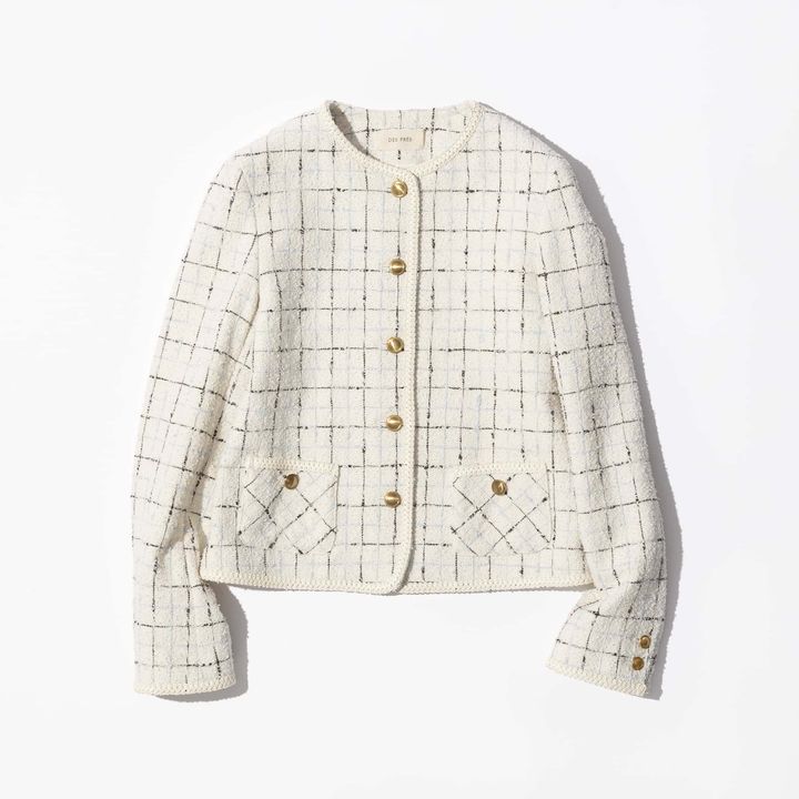 コンパクトで無駄のないスッキリシルエットが美しい、ノーカラーの定番ツイードジャケット。明るいホワイトに上品な金ボタンが春らしさ満点!コンサバは勿論、崩して着ても洒落見えするので、幅広く着回しが利くお役立ちな1枚です。