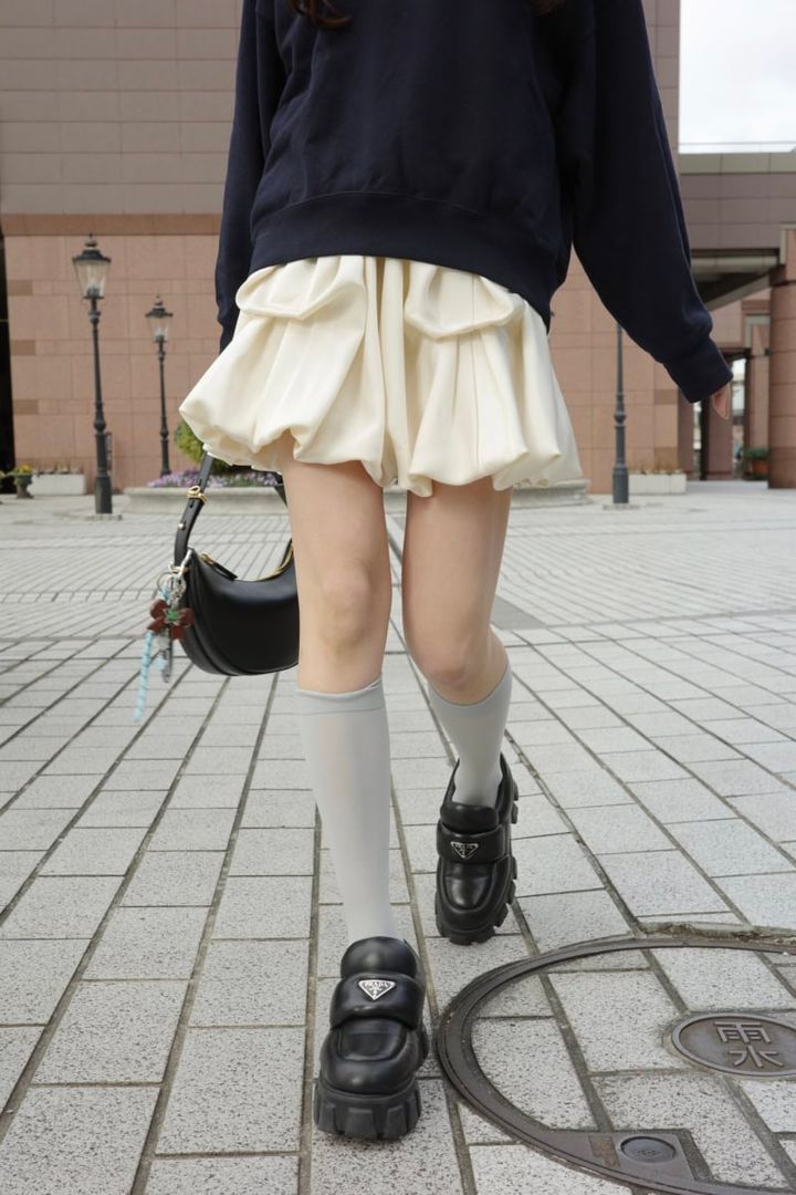 「トップスをカジュアルにまとめているので、ボトムは思いっきりガーリーに。タックバルーンのサテンスカートは、デザインが可愛くて気に入っています。スウェットの中には白シャツを入れて、ラフになりすぎないようにしました!」(idem / ANUブランドディレクター・村田倫子さん)