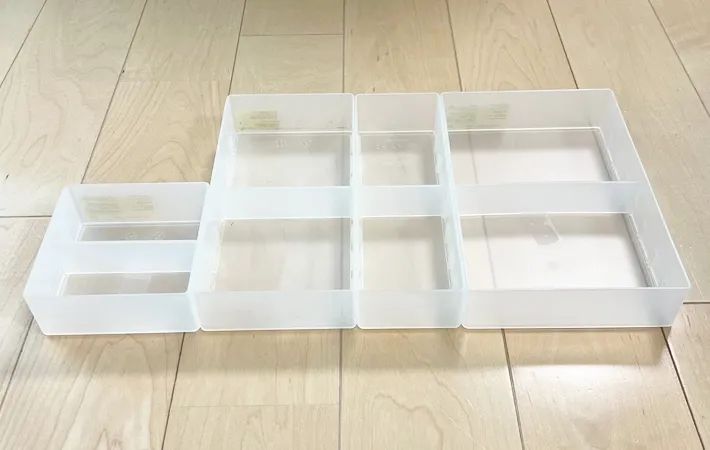 『整理トレー1』から『整理トレー4』まで4つのサイズがあり、組み合わせることが可能。文具などの細かいモノを仕切って収納できる優れものです。