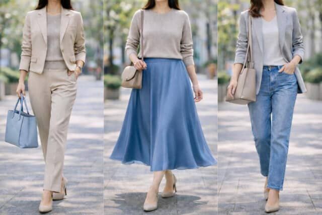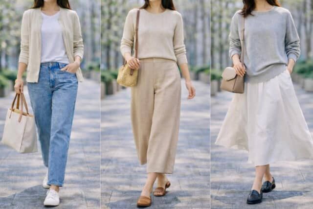 春コーデは、素材をそろえすぎない方がアカ抜けて見えます。例えば、柔らかなニットに軽いジャケット、落ち感のあるボトムを合わせるなど、質感の違いを少しだけ作ることがポイント。同じ色味でまとめても、素材が変わることで立体感が生まれます。