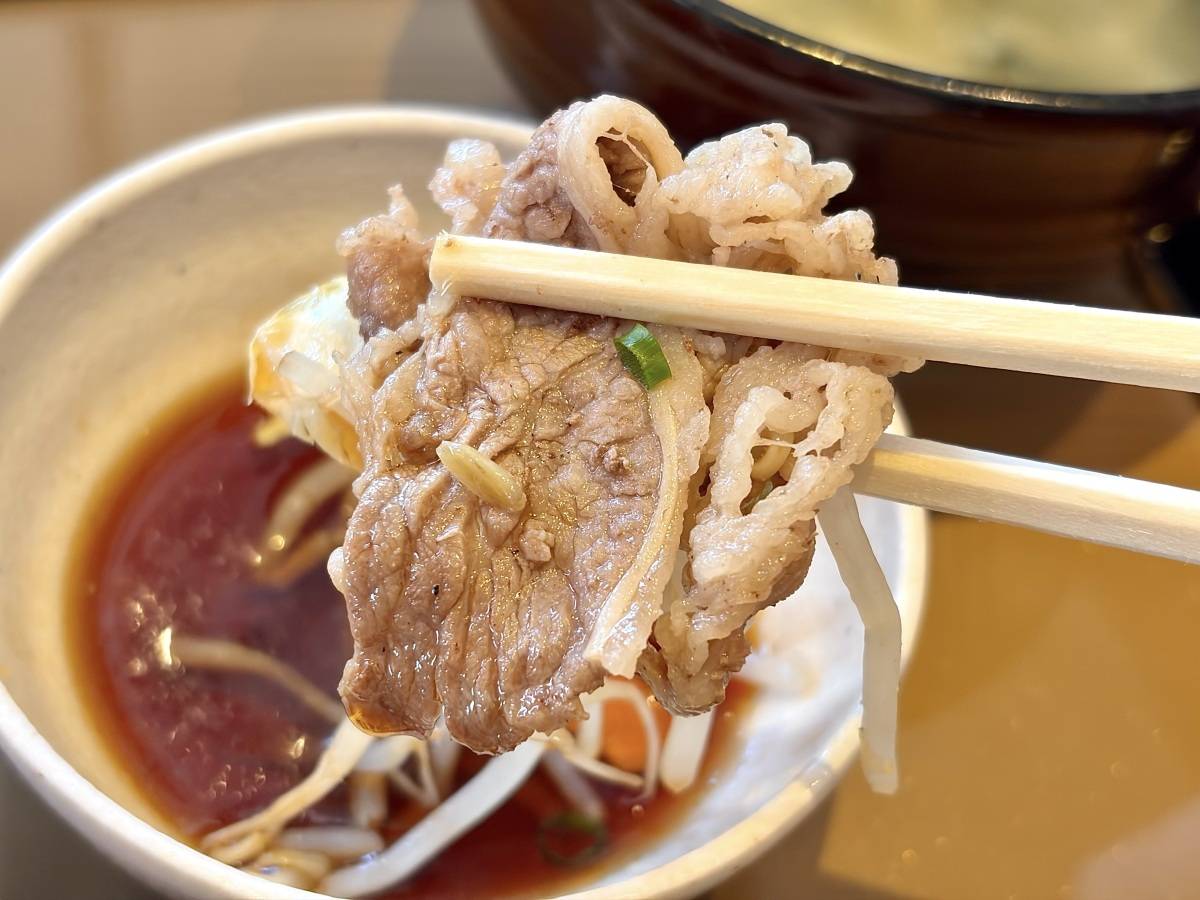 たっぷりのった具材は、牛肉・キャベツ・もやし・にんじん・玉ねぎなど。