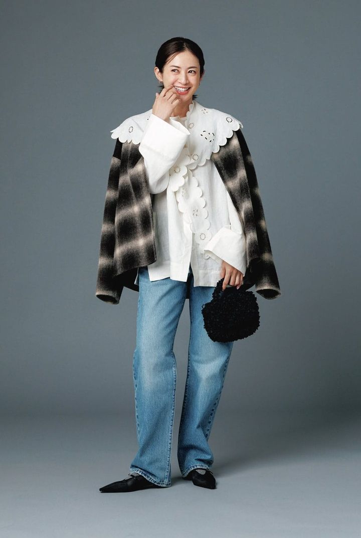 ほどよくゆとりのあるストレートデニムは、どんなトップスも受け止める万能型。大胆な襟レースの甘さも程よくカジュアルダウンしてくれます。体型カバーも叶えながら、大人のこなれ感を演出。