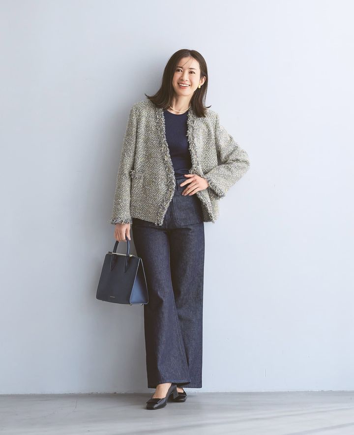 デニムパンツ¥35,200(デ・プレ)ツイードジャケット¥198,000(エブール/リトルリーグ インク)トップス¥33,000(カオス/カオス丸の内)バッグ¥118,800(ストラスベリー)パンプス¥37,400(ファビオ ルスコーニ/伊勢丹新宿本店 本館2階 婦人靴)イヤリング¥11,0{hlb}00ネックレス¥13,200(ともにアビステ)