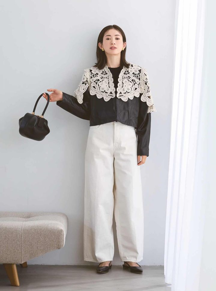 白デニムは、春らしい軽やかさと洒落感を両立できる一本。ほどよいカーブラインが体型を拾わず、旬のシルエットに。黒レザーの辛さやレースの甘さも自然になじみ、異素材ミックスでもバランスよくまとめてくれます。