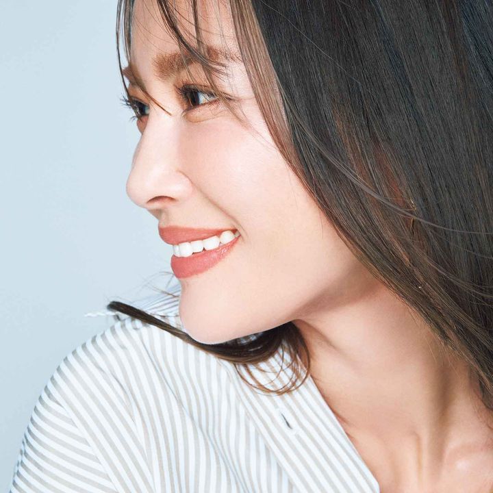 めちゃめちゃ乾燥肌なので一年を通してスキンケアの基本は保湿です。急に小顔にはなれないけれど、少しずつ努力を積み重ねることが大事かな。思えば、出産や子育てで仕事をセーブしていた時期は顔もだらっとしていました(笑)。やっぱり人に見られることでスイッチが入るし、褒めてもらえたらハッピーになってさらにキレイになれる! 小6の娘は最近「ママのメイク可愛いね」と褒めてくれます。高校生の息子は「いいんじゃない?」とそっけないですが仲良しですよ(笑)。どんなマッサージよりもハッピーに笑顔でいることが小顔への近道!家族といる時はいつもみんなで笑わせ合っているので、自然と口角が上がっているようです。