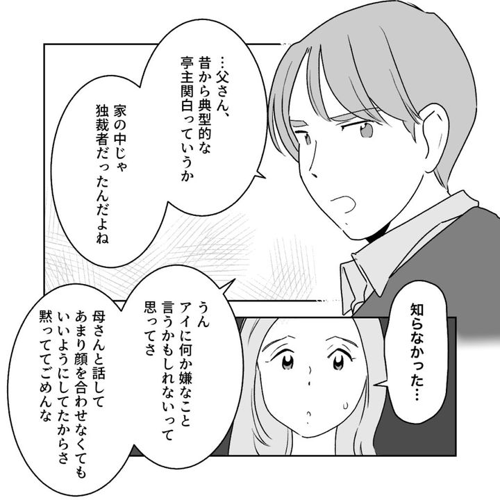 「・・父さん、昔から典型的な亭主関白っていうか、家の中じゃ独裁者だったんだよね」と義父のことを話してくれたコウ。「知らなかった・・」と呟くと、「うん。アイに何か嫌なこと言うかもしれないって思ってさ。母さんと話してあまり顔を合わせなくてもいいようにしてたからさ。黙っててごめんな」と言いました。たしかに、コウと結婚して数年経ちますが、私が義実家に顔を出すときは義父がいないことが多く、あまり関わることがありませんでした。まさかコウや義母が敢えてそうしてくれていたなんて・・全く気付きませんでした。