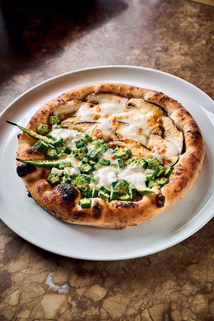 ピザ「しいたけとオクラのハーフ&ハーフ」。 撮影=sono(mame)