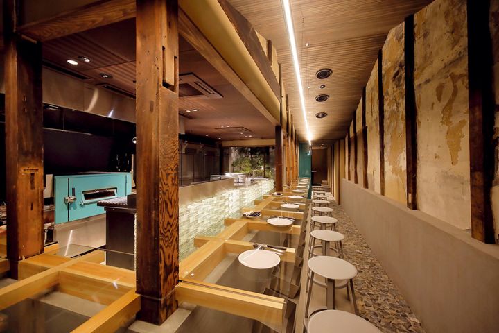 店舗は築約100年の町家を、柱や壁、敷石など京都の暮らしの面影を残しながら、最先端のピッツェリアとして改装した空間。カウンター、テーブル、グループ用の個室などさまざまなスタイルで楽しむことができます。