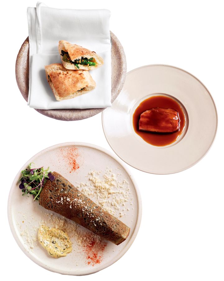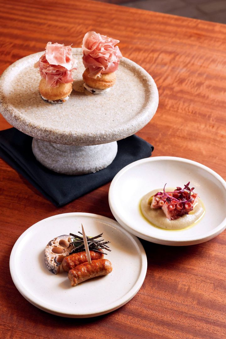 3つの小前菜。上から、揚げたピザ生地に生ハム、蒸したタコと菊芋のピュレ、チョリソーと蓮根と芽キャベツに黒トリュフ。 撮影=高嶋佳代