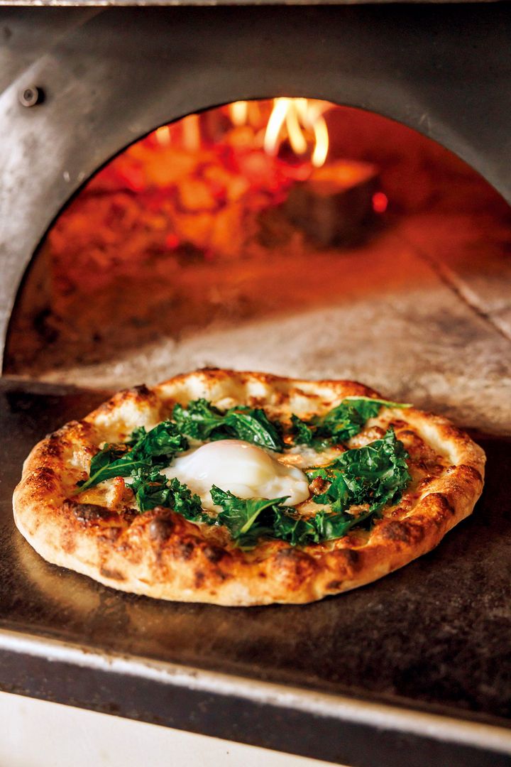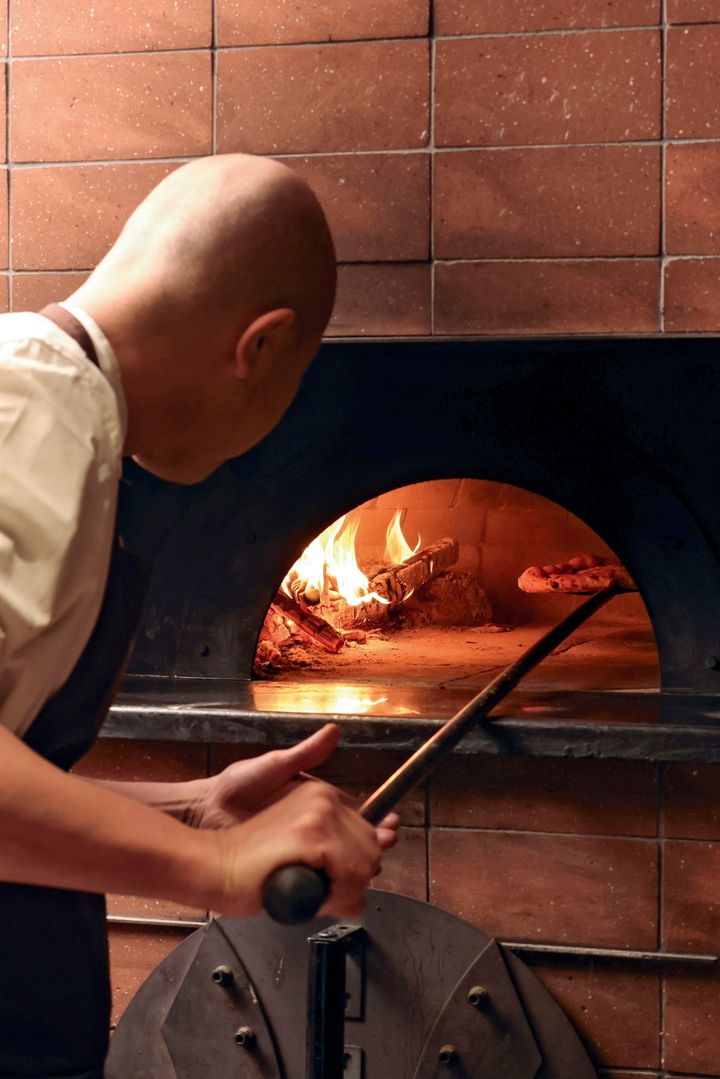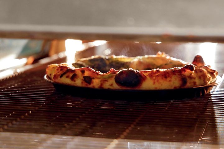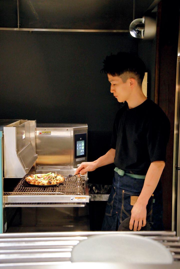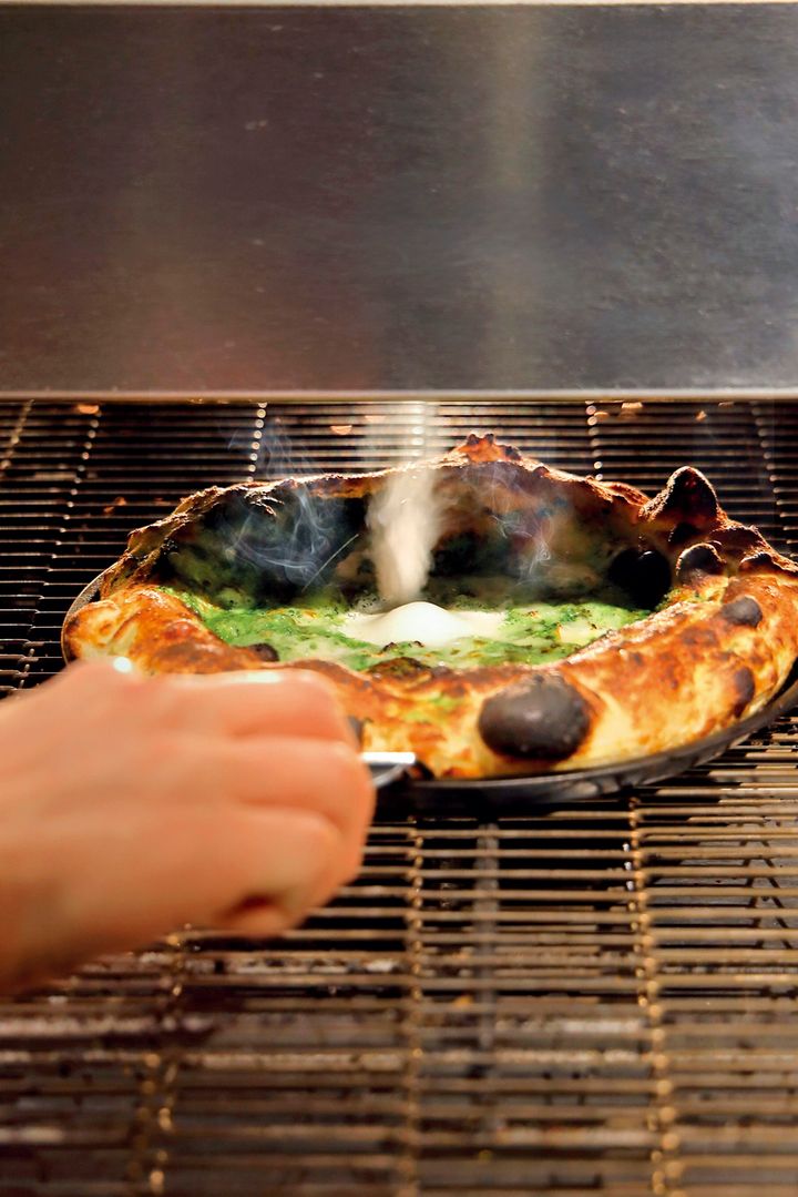 素材やソースをのせた生地を特注のオーブンで焼成。熱を加える数分の間に、香ばしさと素材のみずみずしい香りが立ち上ってくる。 撮影=高嶋克郎