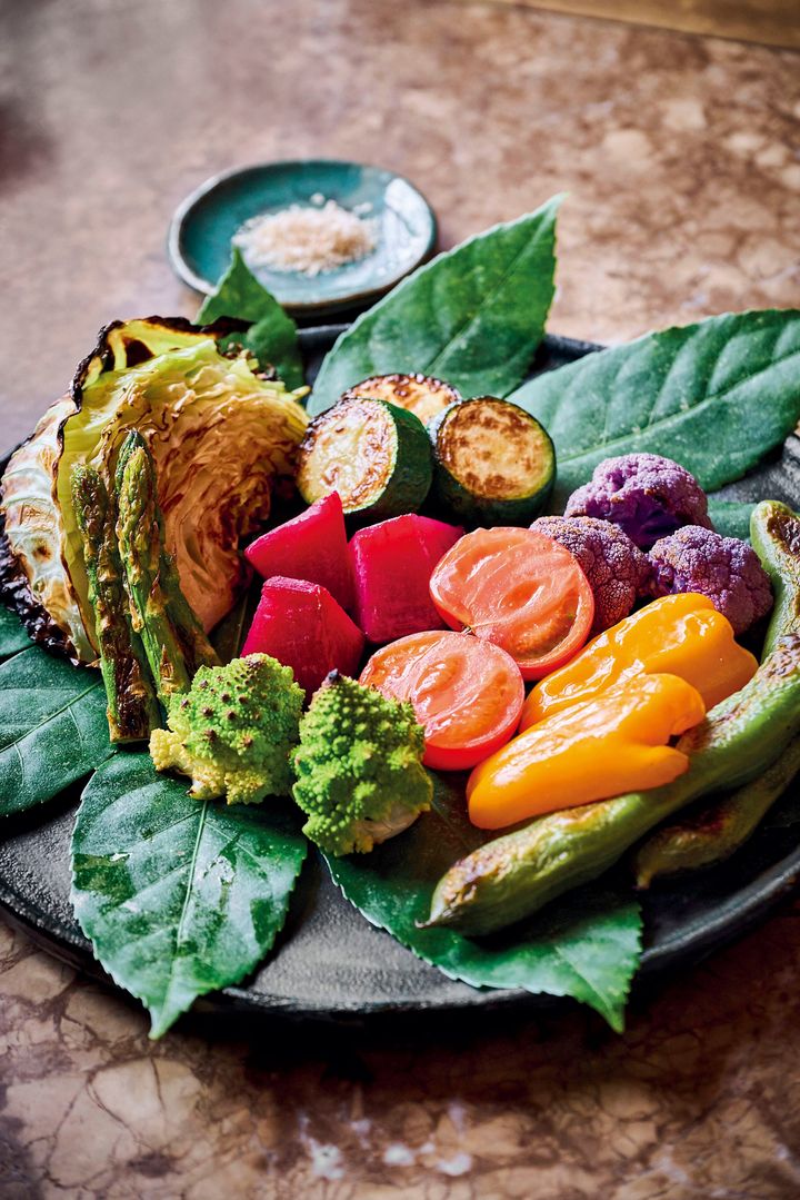 薪火でふっくらとローストした「旬の薪窯焼き野菜」。 撮影=sono(mame)