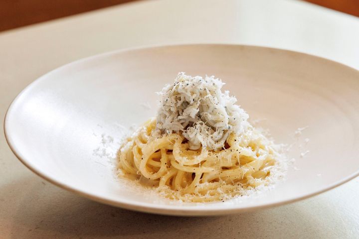 名店で多く使われる山利(和歌山県)のしらすを伊マンチーニ社のパスタにのせた「しらす/カチョエペペ/薪火」2,900円。仕上げに加えた薪オイルが香り高い。 撮影=高嶋佳代