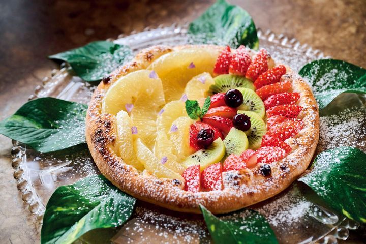 いちご、キウイ、グレープフルーツ、ブルーベリーをのせたデザートピザは、コースに500円追加してオーダー可。 撮影=sono(mame)