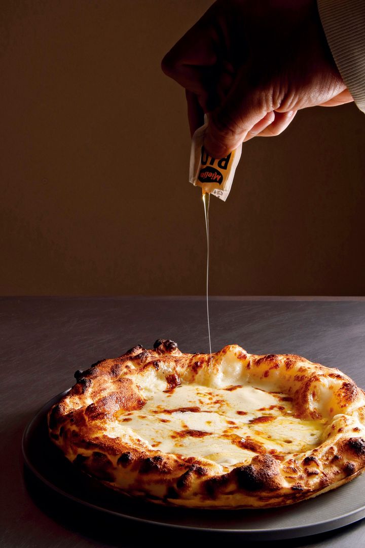 岡山や東京と同じく「どこにもあるもので、どこにもないものを」の思いで作るピザは、「賞味期限は5分」とスタッフが冗談交じりに話すほど、生地や具材、濃厚なチーズが、これ以上ない一体化した状態で出されます。高加水の生地は、焼き上がりの香ばしさ、軽やかさと、嚙み締めたときのもちっとした食感を併せ持ち、生地を味わう幸せが一枚に詰まっています。
