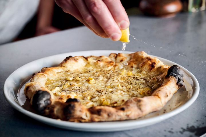 ピザ窯と熾火焼きの窯を構え、動線を考え抜いた厨房は、デザイナーの柳原照弘さんが監修。10品のコースは、マルゲリータやマリナーラという伝統的なピザに加え、藁焼きした魚介やクレープのような焦がし小麦の生地や、ピッツァボンバ(中が空洞)の素焼きの生地を生かした「季節のピザ」を折り込みます。鈴川さんは最高のコースの形を目指して、いまもその構成を進化させています。