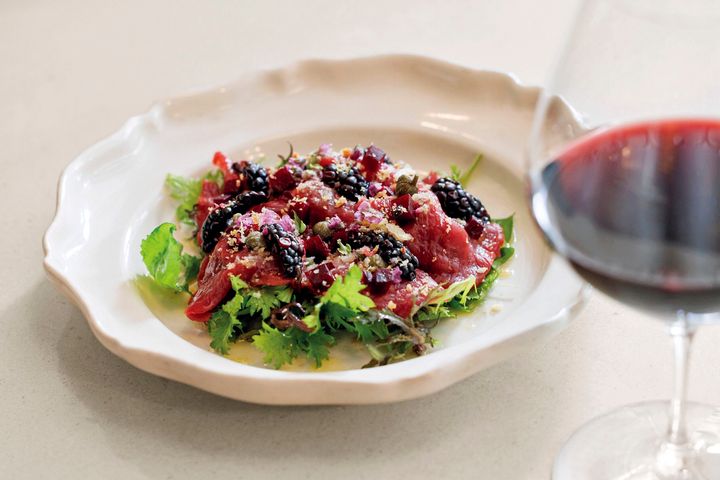 福島県産の馬肉を使ったカルパッチョはワインとの相性もよく、人気の高い前菜のひとつ。「馬肉のカルパッチョ/ビーツマリネ/ケッパー/ベリー」2,500円。 撮影=高嶋佳代