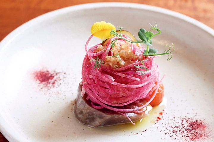 めじまぐろの藁焼き、サラダ仕立て。紅心大根、ミニトマト、エシャロットに、赤ワインビネガーのソース。マイクロハーブは山梨の「村上農園」。すべてコースの一品。 撮影=高嶋佳代