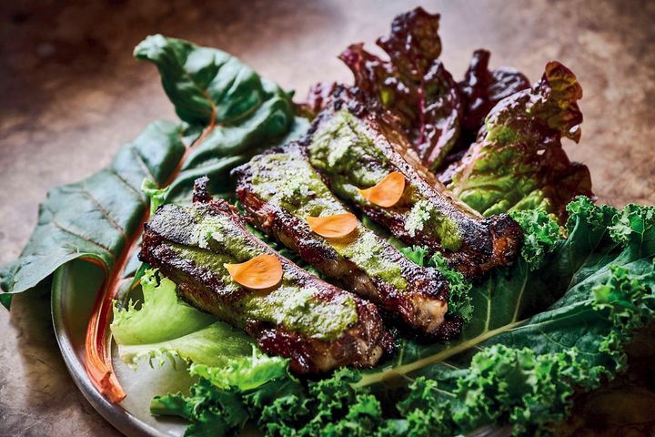 信州産の豚スペアリブをマリネし、薪火で燻製してから強火で焼き上げた「大葉のチミチュリとスペアリブ」。 撮影=sono(mame)