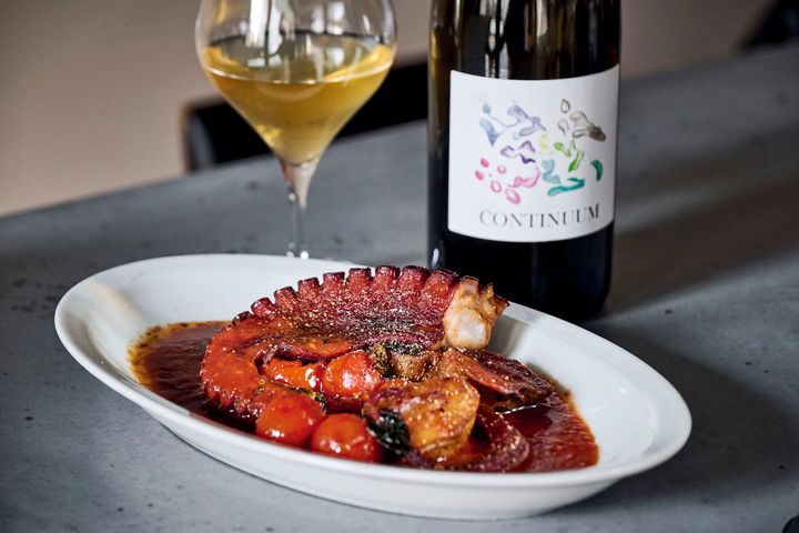 窯でじっくり火を通したたこは軟らかく旨みたっぷり。2,860円。トマトソースはミニトマトのホール缶を使用。「果肉感が残るのもいいんです」。 撮影=sono(mame)