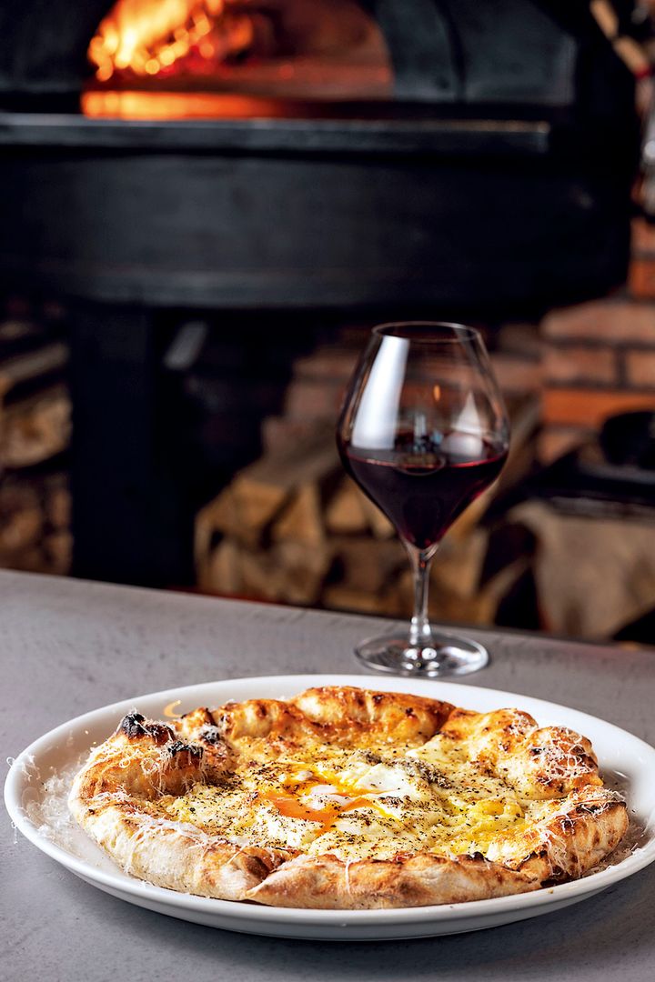 チーズと卵がとろけるカルボナーラのピザ。2,750円。ワインやクラフトビールに合う。 撮影=sono(mame)