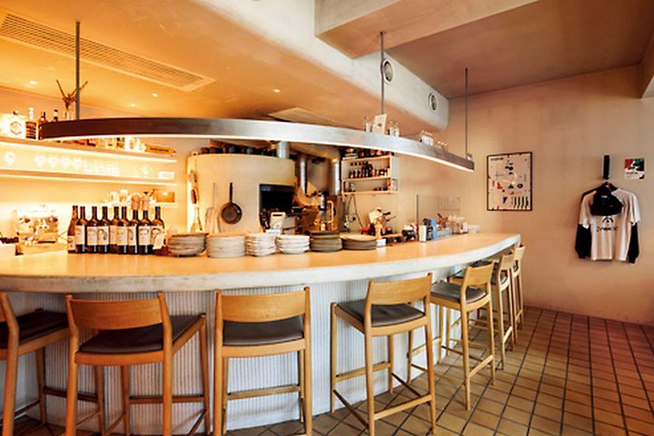 兜町の人気フレンチ「Neki」シェフの西恭平さんが薪火料理の魅力に惹かれ、2022年にオープン。「songbook」というユニークな店名は写真家アレック・ソスの写真集から取ったといいますが、その作品に漂うグルーヴやミックスカルチャーが感じられる居心地のよさから、いつもにぎわう人気店に。