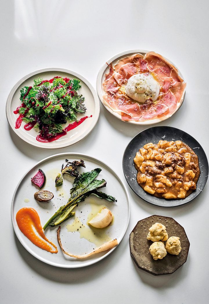 有機野菜のサラダ、群馬産生ハム、薪火料理、ピザ生地を使った一品などでコースを構成。 撮影=sono(mame)