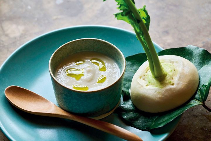 薪火でローストしたかぶを白味噌で仕立てた「かぶのポタージュ」。 撮影=sono(mame)