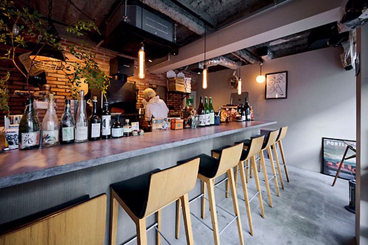 レコードが回るこぢんまりとした店内。カウンターが中央にある薪窯を囲うような造りは、飾らない洒脱な印象です。毎夜ピザとお酒を楽しむ人でにぎわう店は、後藤崇暁さんがひとりで切り盛りしています。