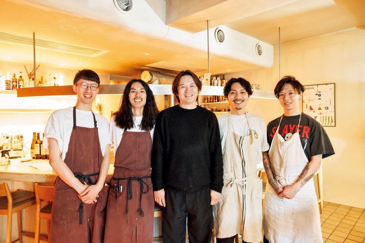 西恭平シェフ(中央)を囲み、西尾浩三さん(右から2人目)ほかチーム「songbook」。店の内装やTシャツ、エプロンなどデザイン性の高さも話題を呼んでいる。 撮影=高嶋佳代