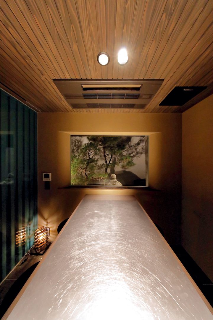 古い柱や壁を生かしながら新旧の魅力をつなぐデザイン、照明が施されている。4名用個室。 撮影=高嶋克郎