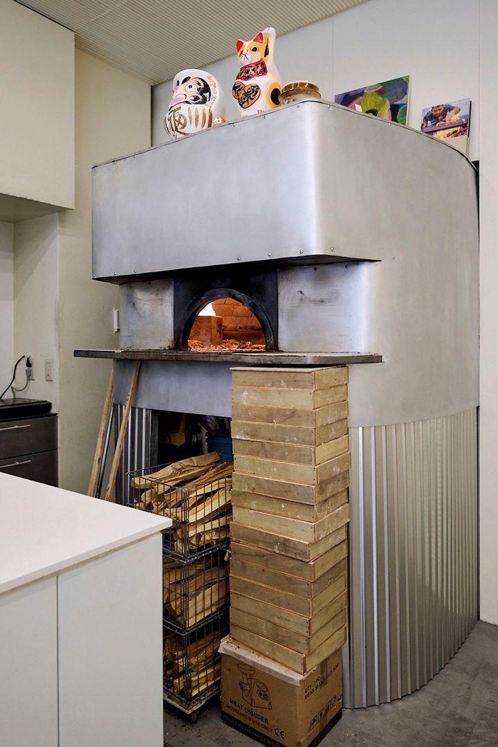 薪とガスのハイブリッド方式で、煤を出さずに高熱で焼き上げることができる窯やパーラ(ピザをのせて出し入れする柄の長い道具)も店主ナポさんが自ら設計し、製作。 撮影=sono(mame)