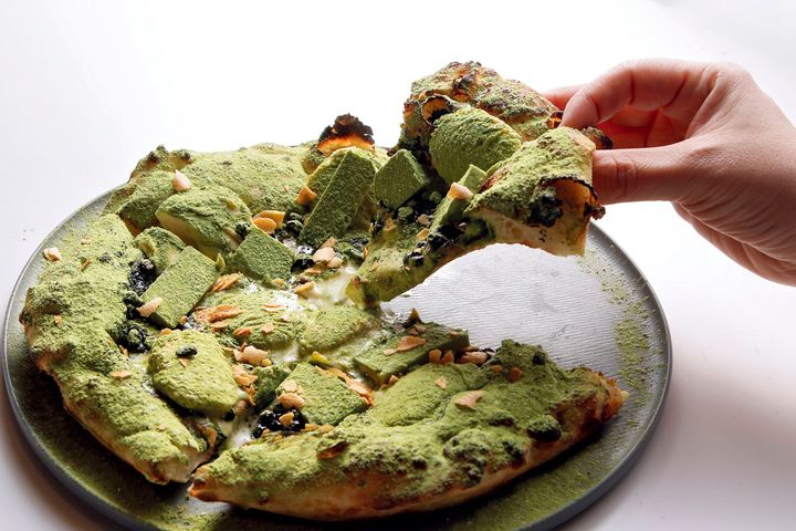 マスカルポーネ、ブルーチーズに抹茶の香り、ピスタチオのアイスクリームを重ねたデザートピザ「チャモーレ」2,900円。 撮影=高嶋克郎