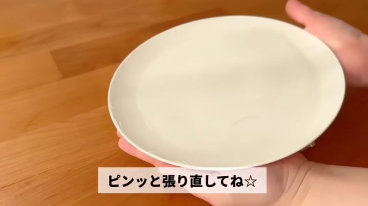 電子レンジOKの丸皿(直径20cmほど)を2枚用意して、ラップをピンと張ります。