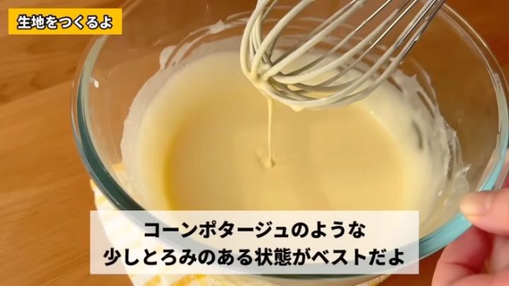 このとき、コーンポタージュのような少しとろみがある状態がベストです。泡だて器で持ち上げたときに、落ちた生地がリボン状に重なってもったりしている場合は、逆に少しかたいので牛乳を大さじ2ずつ加えてかたさを調整しましょう!