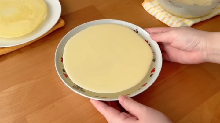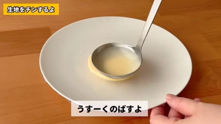 生地はコーンポタージュのような少しとろみがあるくらいがベストです。厚みは均一に、お皿に薄くのばしましょう。