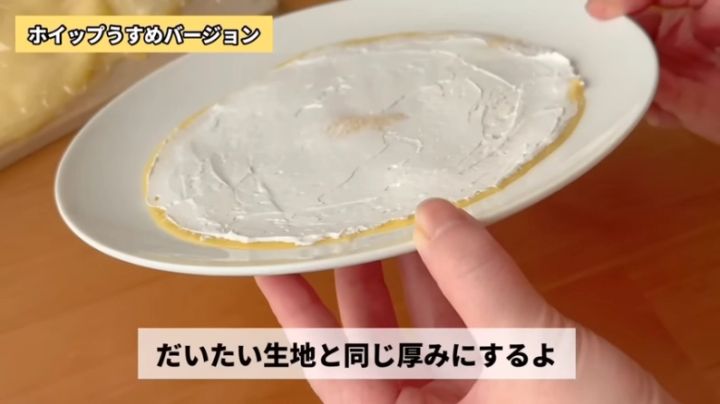 生地をお皿にのせ、少なめにホイップクリームを絞り、ゴムベラなどで全体に塗り広げます。生地の厚みと同じ厚みにしましょう!