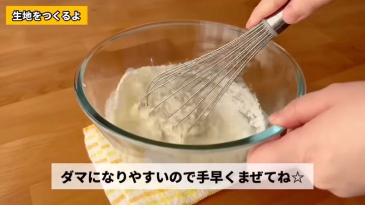 ① ボウルにホットケーキミックスを入れ、牛乳を加えて混ぜる