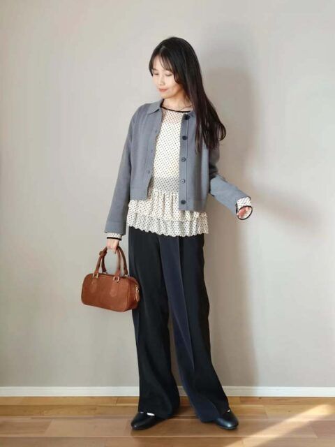 【40代50代のショート丈トップスコーデ4】裾フリルの長めインナーがあると便利!