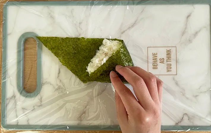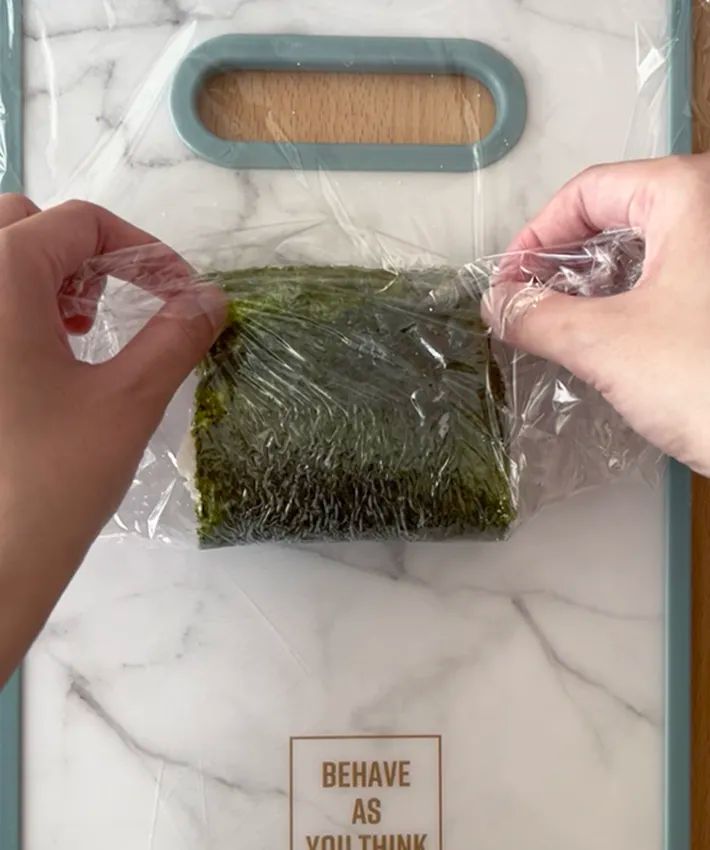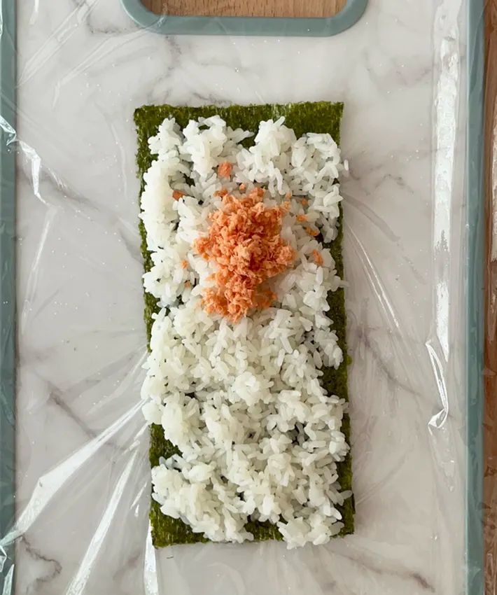 加えて、ラップを使うことでご飯や海苔に直接触れずに作れるため、手が汚れにくいのも嬉しいポイントでした。