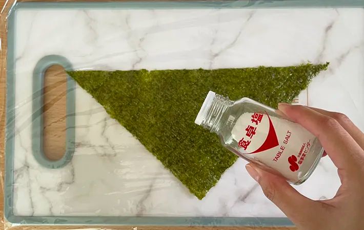 続いては、ラップを活用した裏ワザ。ラップの上に半分のサイズにカットした海苔を置き、塩を振ります。