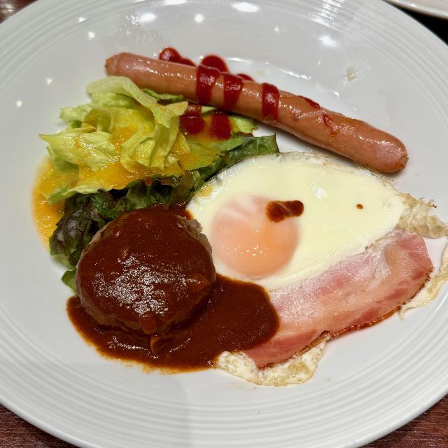 朝からハンバーグが楽しめるのがうれしいポイント。ミニと言いながらも十分なサイズで、ソースも美味しい!ソーセージも大きく、サラダのドレッシングまでしっかり美味しいです。