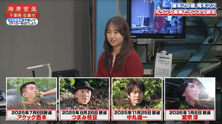 『相席食堂』の新人女性ディレクターは、MCのお笑いコンビ・千鳥から「埋め師」と呼ばれている。これまで彼女は、宝塚歌劇団の元トップスターで女優の紫吹淳、元KAT-TUNの中丸雄一のほか、ジェラードンのアタック西本、つまみ枝豆といった芸人を畑に埋めて、千鳥に衝撃を与えた。