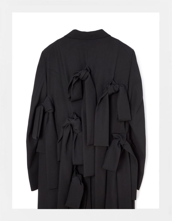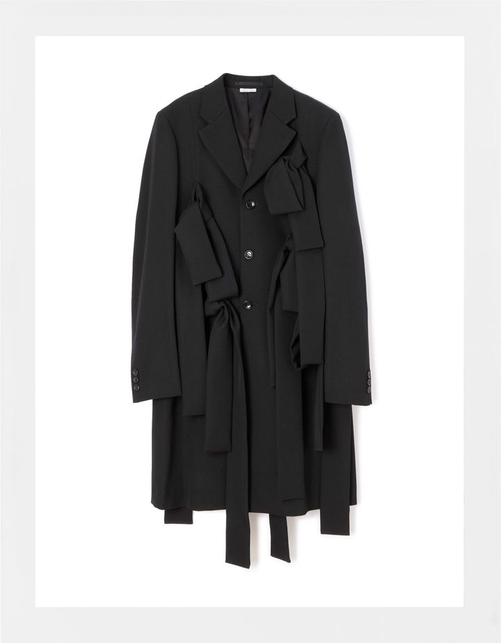 2025年2月頃に購入した、コム デ ギャルソン・オム プリュスの2025年春夏コレクションです。オーバーコートとジャケットの中間くらいに使えるアウターを探していて、コム デ ギャルソン青山店に立ち寄ったときに偶然出会いました。基本はクラシックなチェスターフィールドスタイルでありながら、ラフに垂れ下がる(背中にも)リボンにコム デ ギャルソンらしい挑発的な主張があり、「これだ!」と即決。トラッドがベースにあるので、仕事にもちょうどいい具合だと感じました。メンズ仕立てなので、インナーはフェミニンなブラウスでもTシャツでも、何でも取り込めるところが魅力。