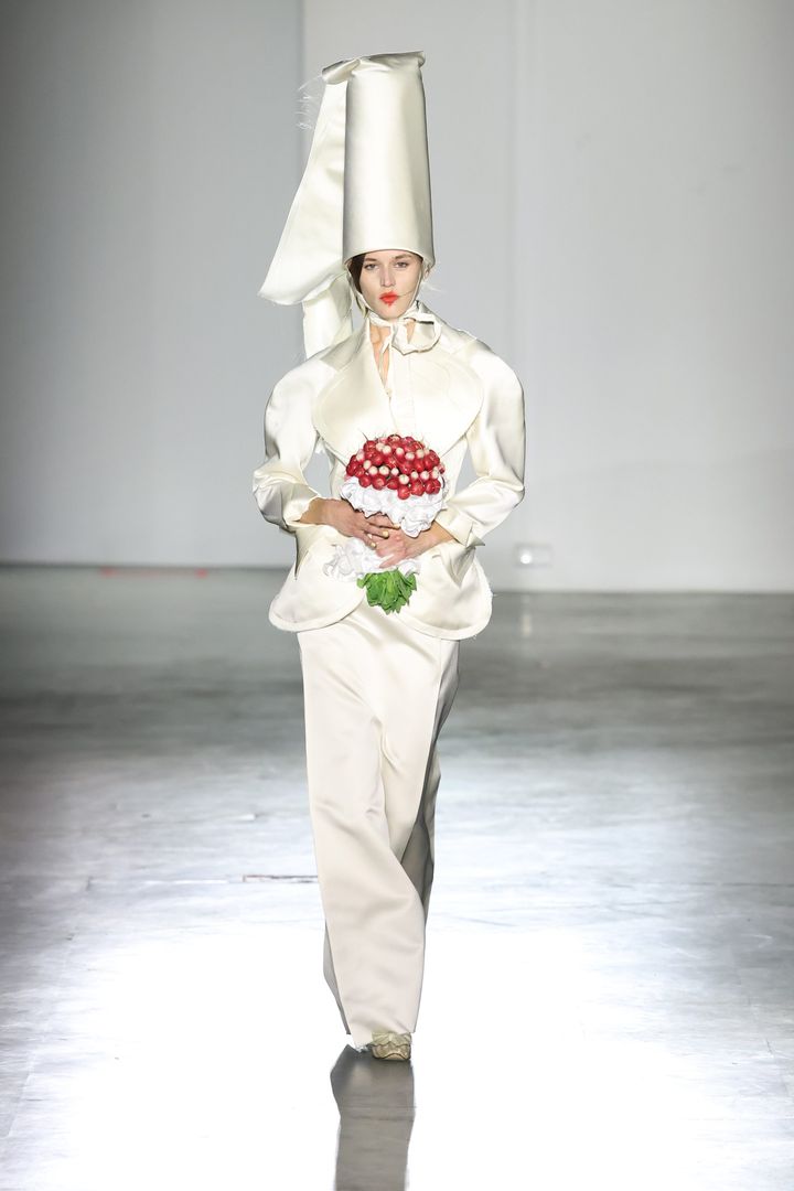 上質なサテンの光沢が美しいセットアップに、中世の貴族を思わせる構築的なヘッドドレスを合わせ、クラシックを大胆に再解釈。ラディッシュを束ねたアバンギャルドなブーケが、遊び心を添えています。